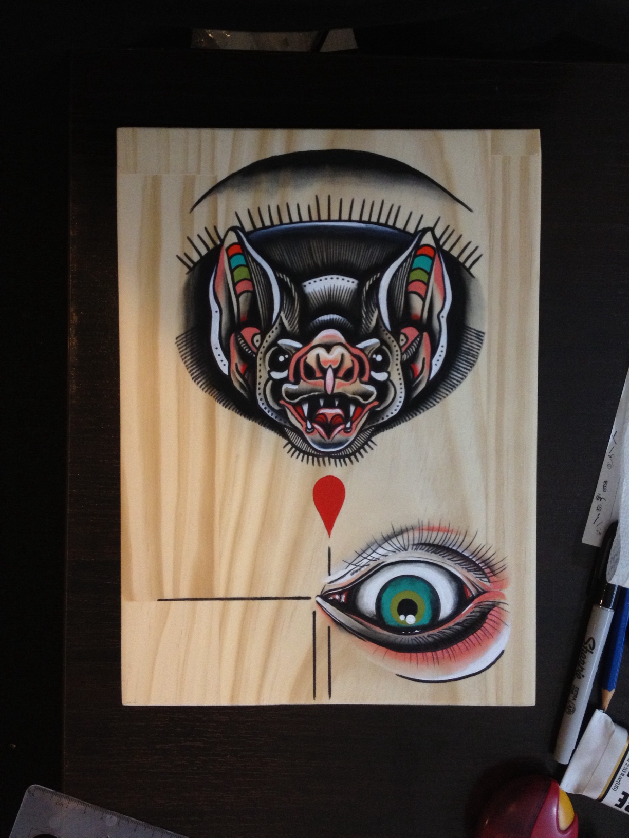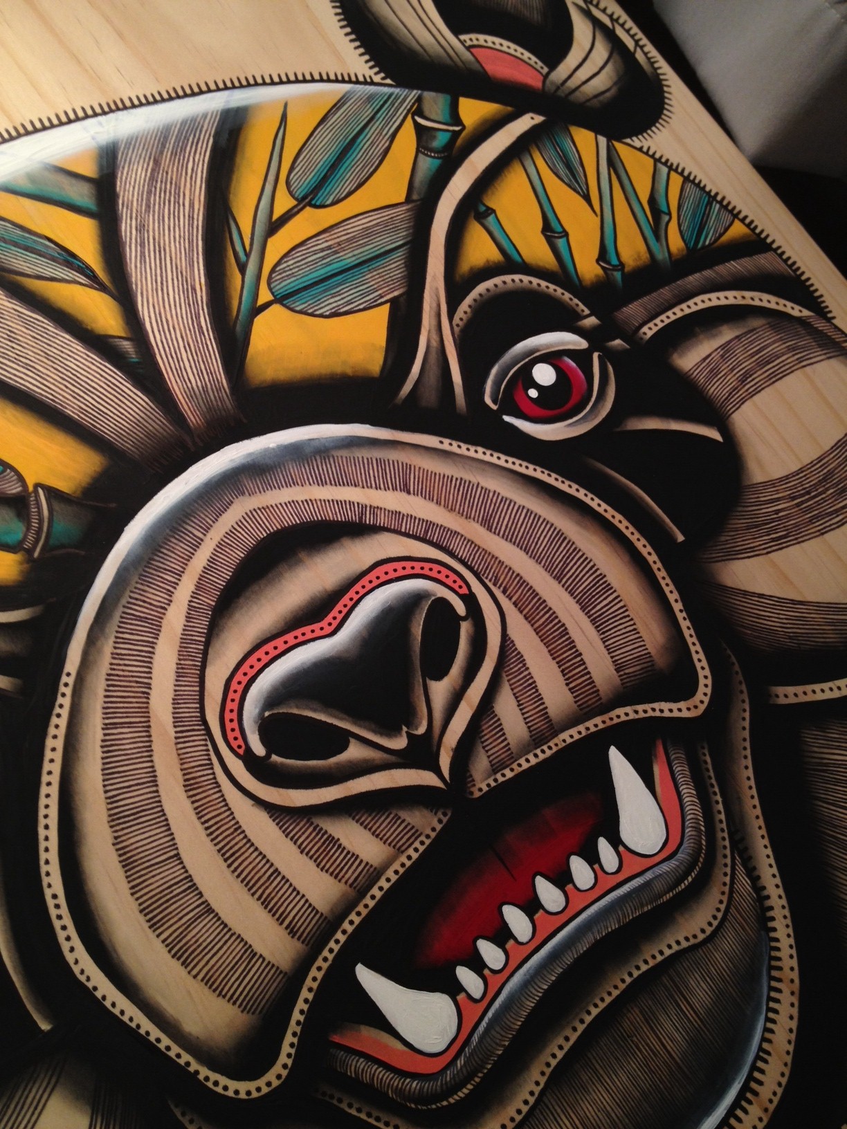 I use acrylics on wooden surfaces as my choice of medium. Animals of all shapes and sizes are what I use as my subject matter. I like to translate my stories into animal form and I feel like it simplifies what I want to say.